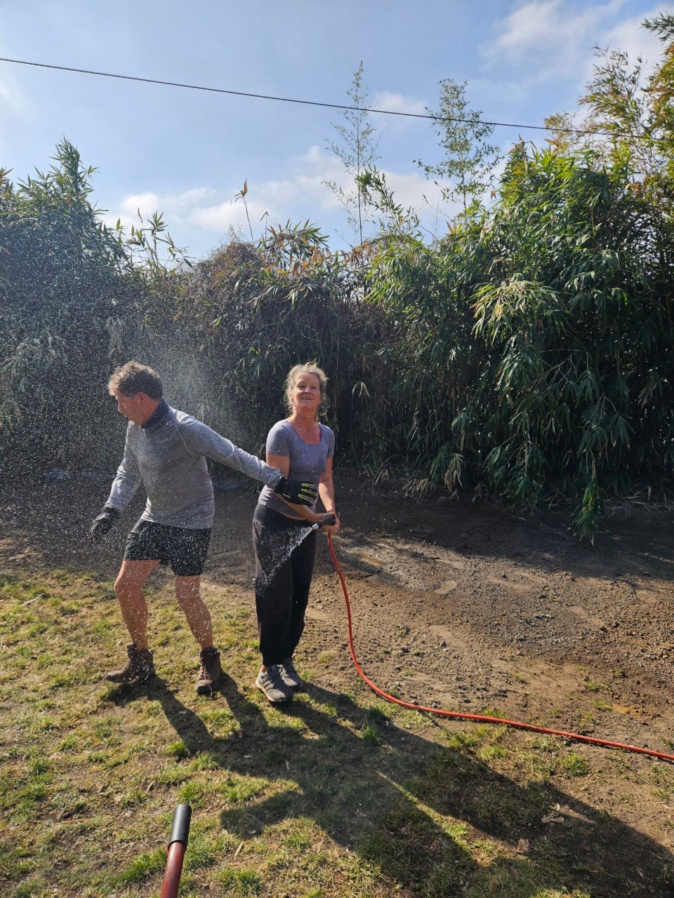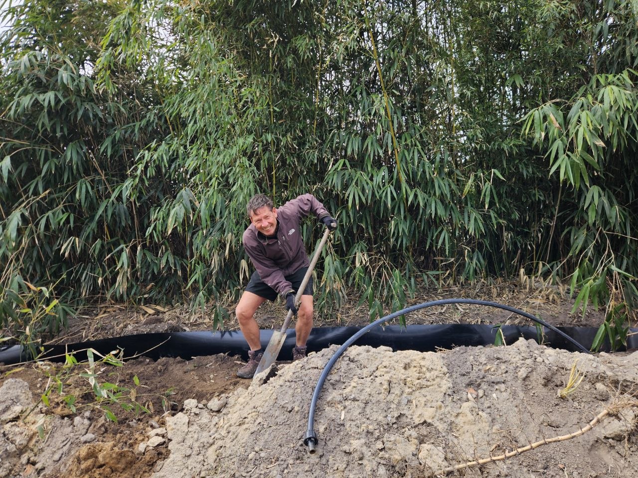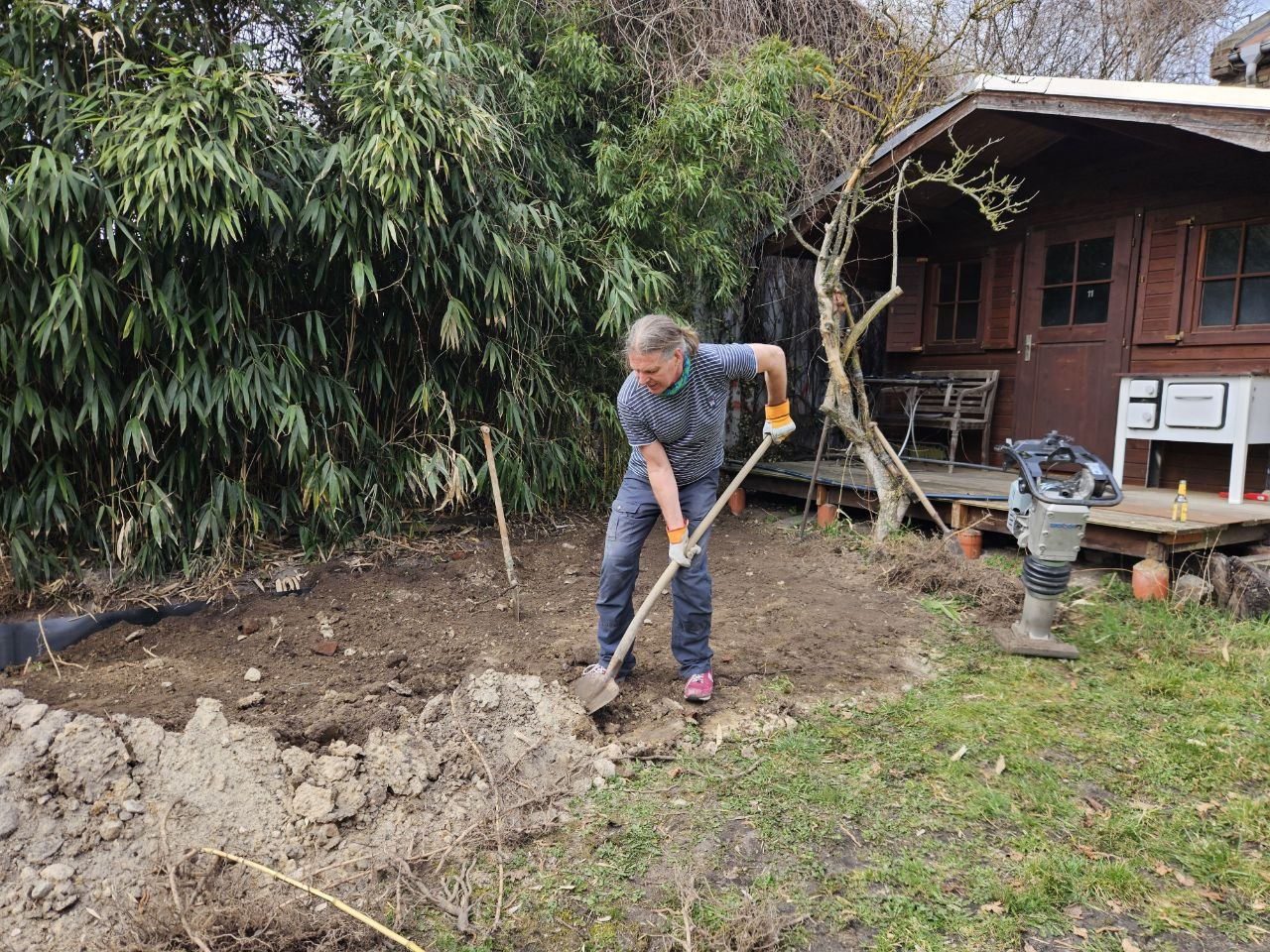 Wir haben das Bambus-Wurzelwerk zurückgedrängt, neuen Rasen gesät und Gräben, Gräben, Gräben, in denen Wasser-Leitungen verlegt wurden, zugeschippt und besamt 😊.